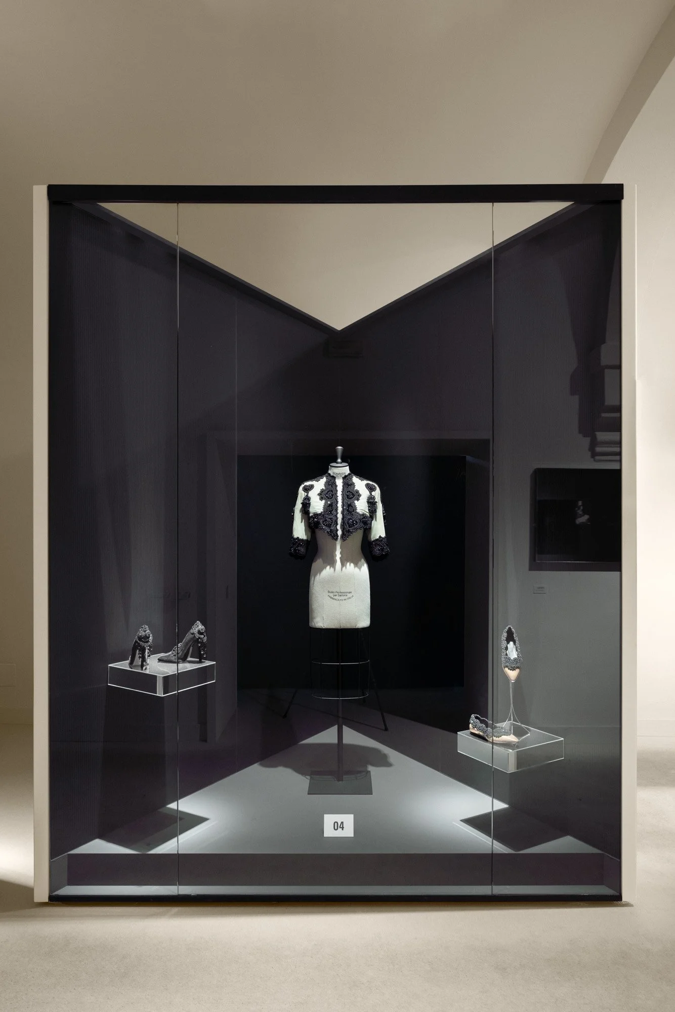 The exhibition, designed by Elisa Ossino Studio and organized by Shoes from Spain, is a tribute to Cristòbal Balenciaga, one of the great masters of fashion who knew how to transform fabric into sculptural art. In an evocative and refined itinerary, Balenciaga's clothes, true works of timeless art, dialogue with Spanish footwear of the highest craftsmanship level. The exhibition itinerary develops through a play of light and shadow and is marked by the alternation of two colours: the butter white of Balenciaga's atelier at GeorgeV no.10 in Paris and the deep black of the maison's most iconic creations.